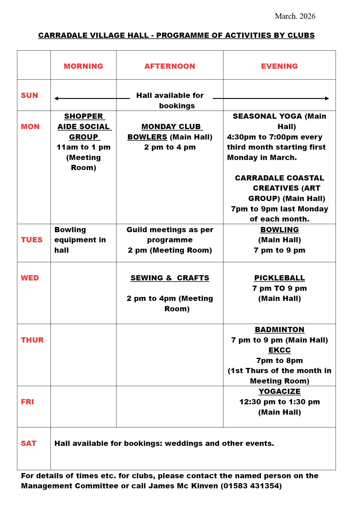 Check out the Village Hall Facebook page for the latest news: